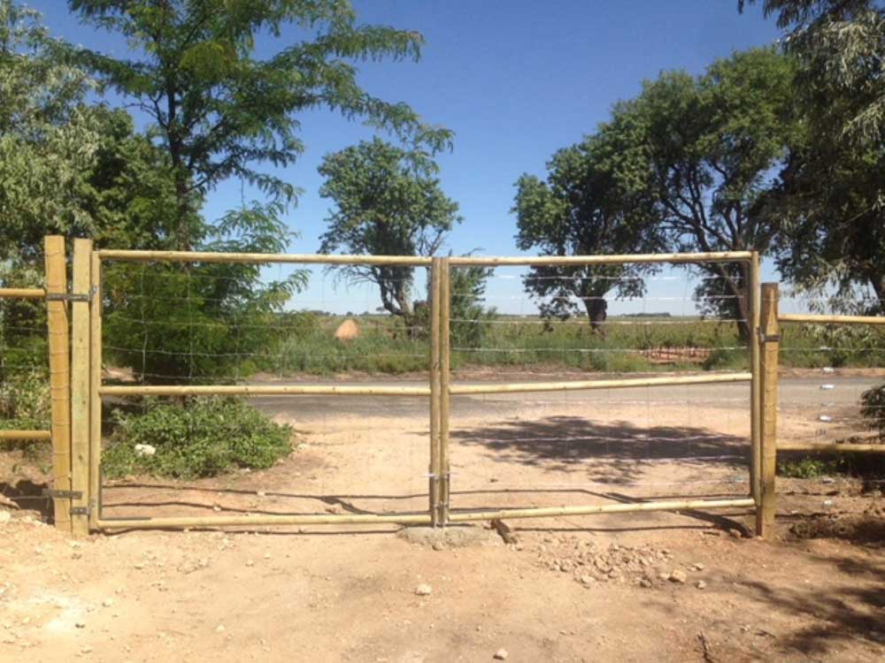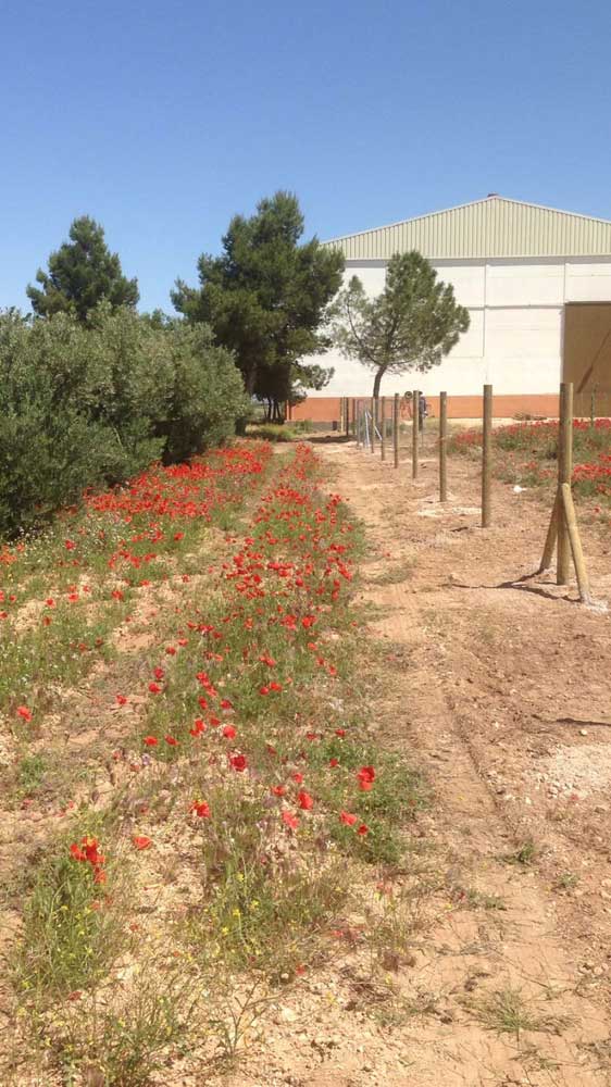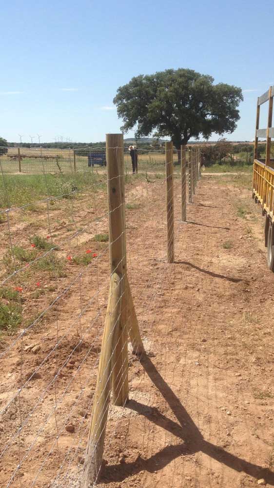 Vallado realizado en Villarrobledo (Albacete). Malla ganadera galvanizada, sobre poste de madera tratada, anclada a terreno con hormigón. Medición 500 ml. Cerramiento en Villarrobledo.